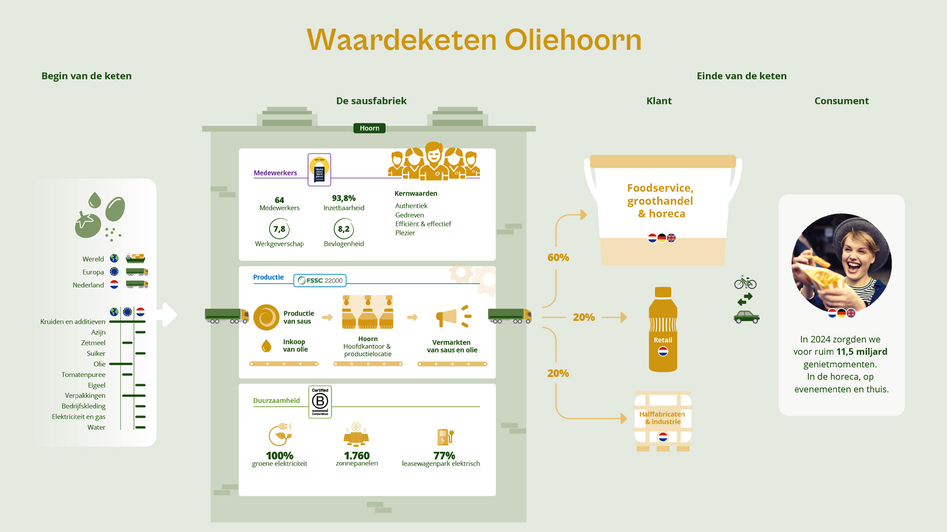 We wilden profiteren van het sterke bedrijfsimago en verder bouwen aan de merknaam. Vandaar dat de naam ongewijzigd bleef en het logo gerestyled werd. Visie, missie en merkwaarden werden helder geformuleerd en de herpositionering werd ondersteund door een authentiek merkverhaal. Daarna werd de merkarchitectuur onder de loep genomen, is het productassortiment aangescherpt en werden de etiketten en verpakkingen vernieuwd. Daarnaast bedachten we een onderscheidende pay off: Oliehoorn. Sensausioneel lekker! Om dit alles te borgen is de totale corporate identity vastgelegd in een online Brandbook.
